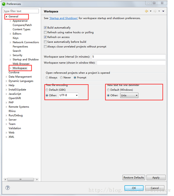 3 最后在General->Workspace中选择UTF-8和Unix编码风格即可。