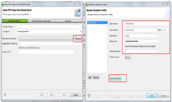2,点击Manage,输入host及用户名密码,同时点击Test Connection测试连接是否正常。