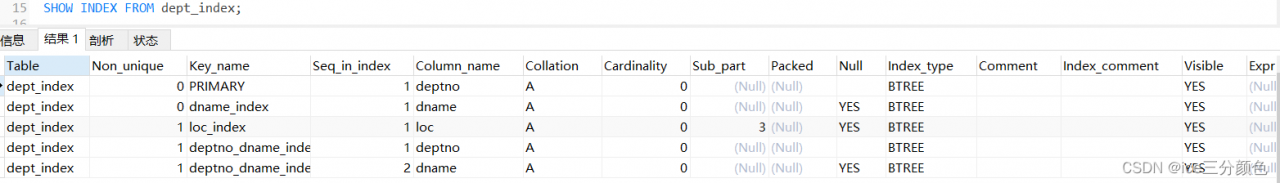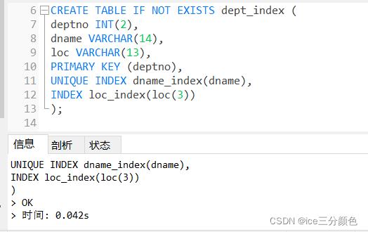 例:创建dept_index表时为dname字段建立一个唯一性索引dname_index,为loc字段的前3个字符创建一个前缀索引loc_index。