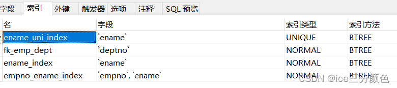 我们也可直接在navicat中employee表右键设计表处查看索引,如下
