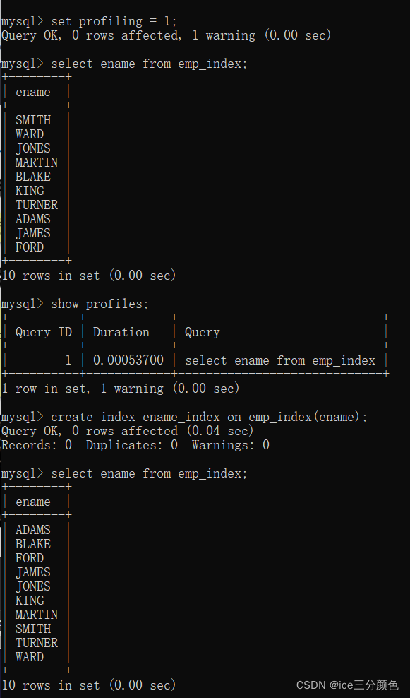 例:对员工姓名在加入索引前后进行执行时间性能分析(过程如下)