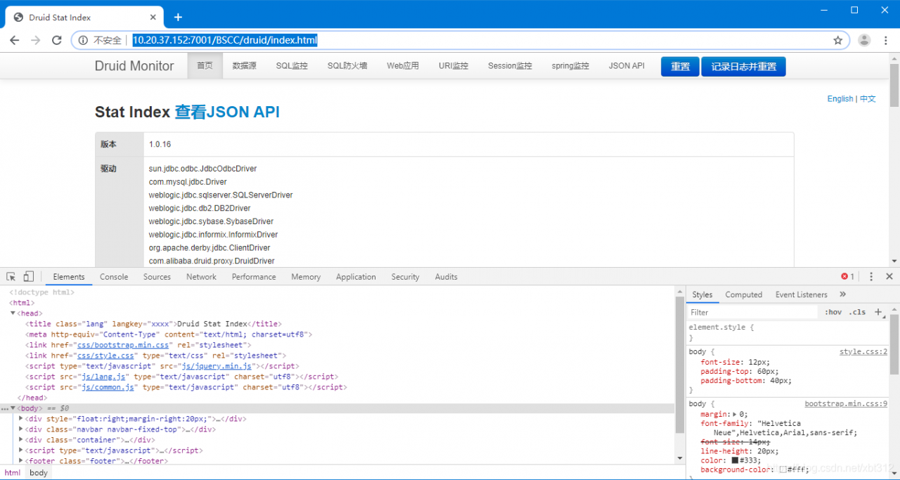 druid 未授权访问http://10.20.37.152:7001/BSCC/druid/index.html版权声明:本文为xbt312原创文章,遵循CC 4.0 BY-SA版权协议,转载请附上原文出处链接和本声明。原文链接:https://blog.csdn.net/xbt312/article/details/100932641