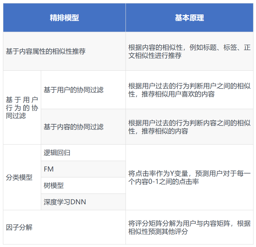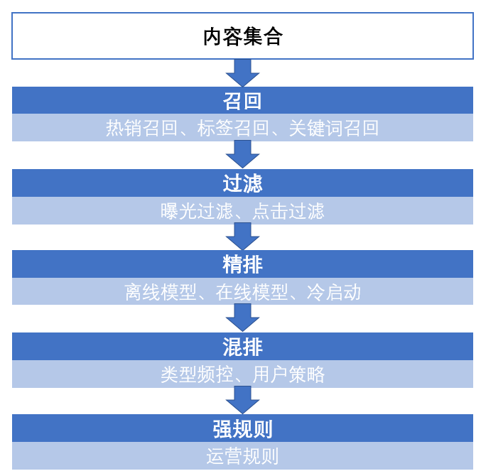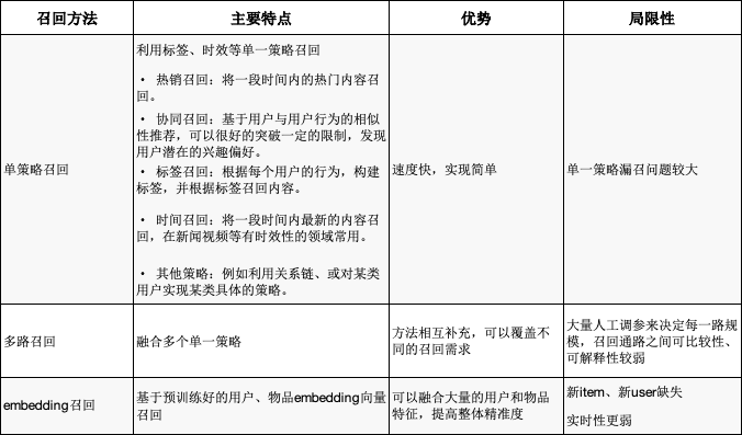 召回:当用户以及内容量比较大的时候,往往先通过召回策略,将百万量级的内容先缩小到百量级。