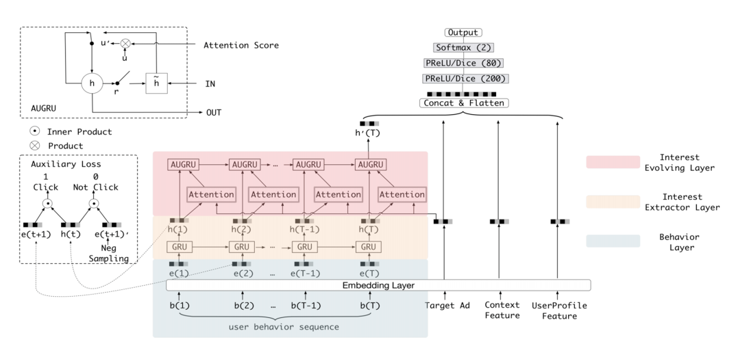 弥补DIN没有对行为序列进行建模的缺点,通过序列层,兴趣抽取层,兴趣进化层。其中利用序列模型利用商品ID和前一层序列模型的embedding向量,输出商品embedding与兴趣embedding。