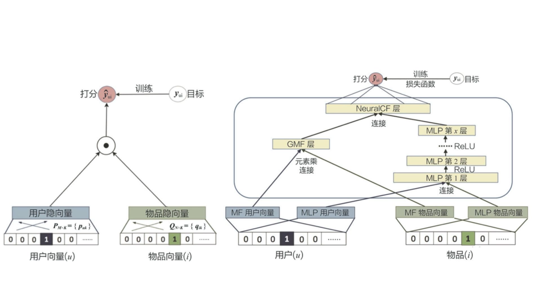相比传统机器学习推荐模型,深度学习具有更加复杂的模型结构,而使其具备了理论上拟合任何函数的能力。同时深度学习的结构灵活性可以让其模拟出用户兴趣的变迁过程。左侧传统推荐模型与右侧深度学习推荐模型对比,其模型复杂度增加: