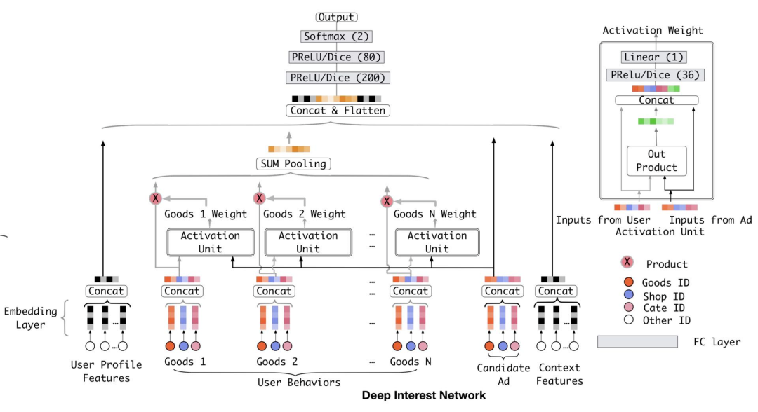 DIN模型为阿里的电商广告推荐模型,预测其广告点击率。它主要利用注意力机制,即通过用户历史行为序列,为每一个用户的历史购买商品上面加入了激活单元,激活单元相当于一个嵌套在其中的深度学习模型,利用两个商品的embedding,生成了代表他们关联程度的注意力权重。