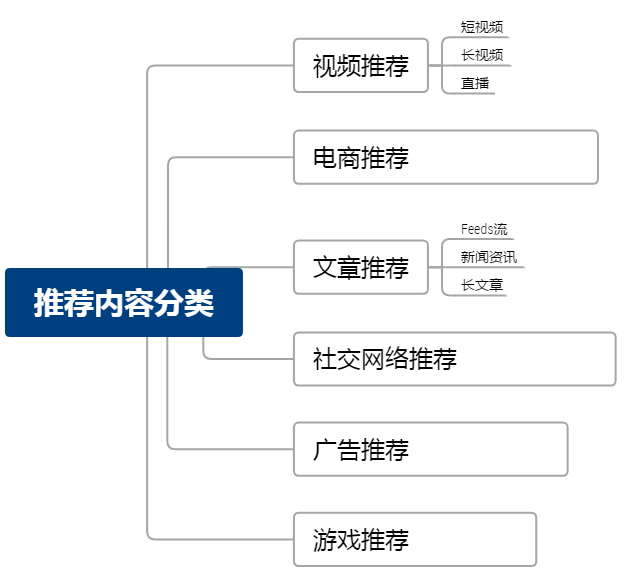 推荐内容与场景通常可以分为以下几类,根据所推荐的内容不同,其内容画像的处理方式也不同。
