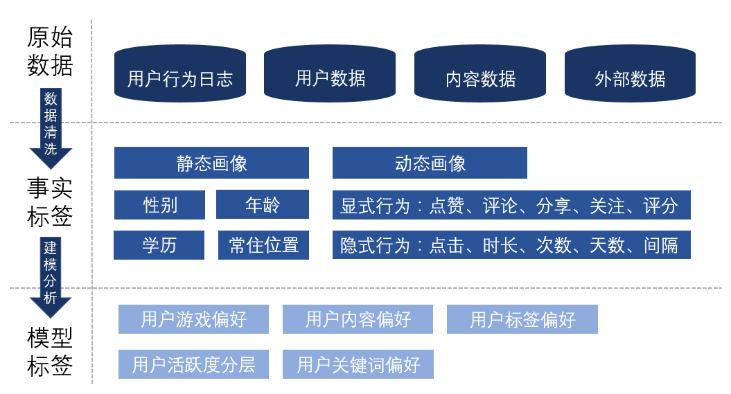 用户与内容的交互:基于用户的行为,了解了什么样的用户喜欢什么样的游戏品类、关键词、标签等。