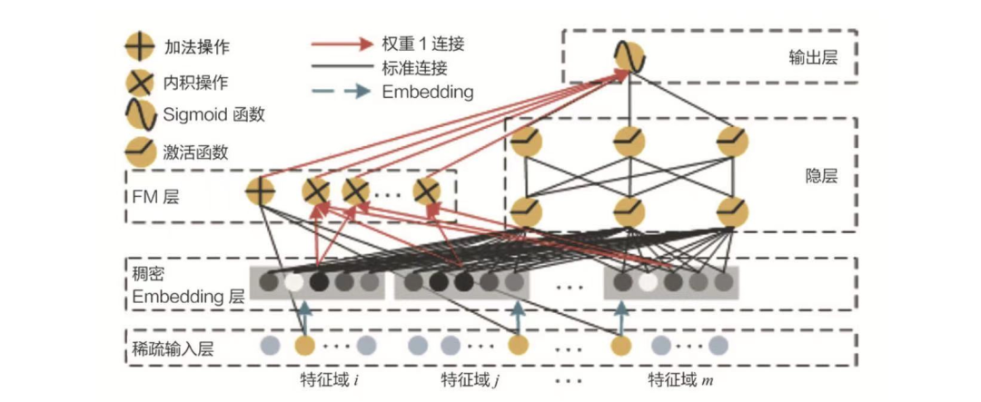 由FM与深度学习模型的结合生成的DeepFM模型:即FM替换了Wide&Deep的Wide部分,加强了浅层网络部分特征组合的能力,右边的部分跟Deep部分一样,利用多层神经网络进行特征的深层处理。