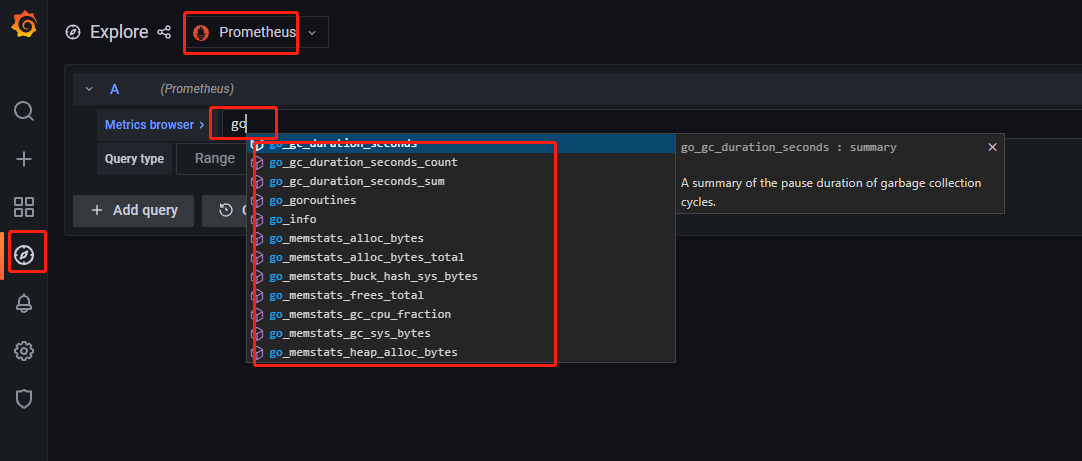 (5)然后打开【Explorer】,选择【Prometheus】源,输入go,能看到如下提示回显,表示数据源已经配置正确。