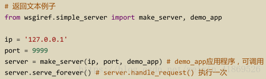 wsgiref.simple_server.make_server(host,port,app,server_class=WSGIServer,handler_class=WSGIRequestHandler) 启动一个WSGI服务器。