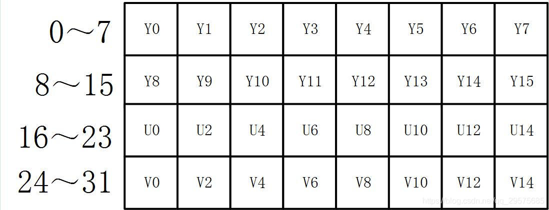 YUYV 格式是采用打包格式进行存储的,指每个像素点都采用 Y 分量,但是每隔一个像素采样它的UV分量。