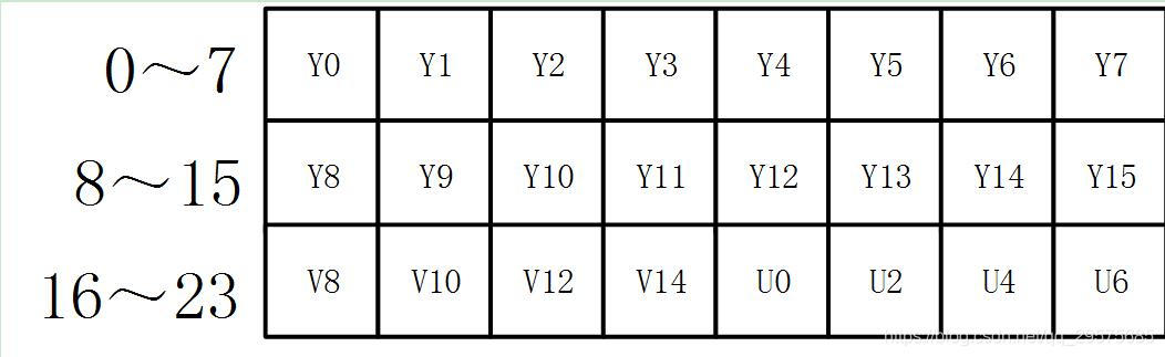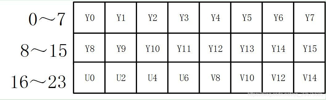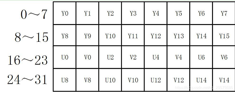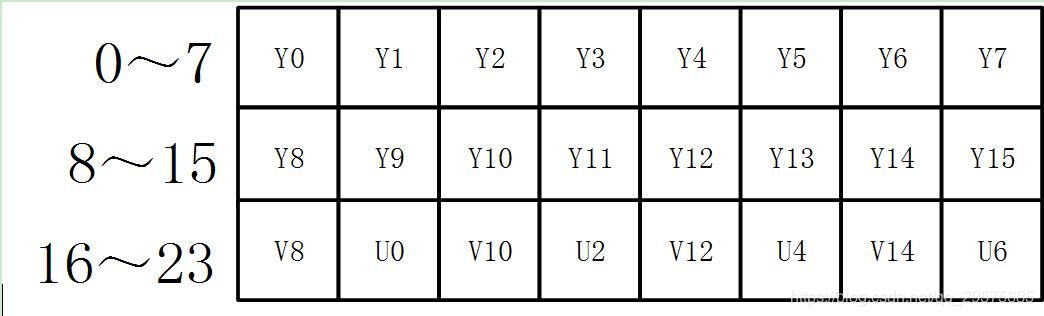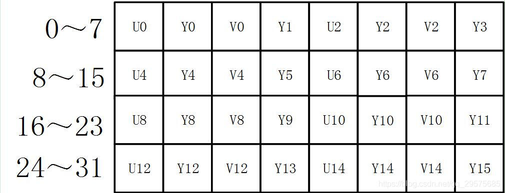 UYVY 格式也是采用打包格式进行存储,它的顺序和YUYV相反,先采用U分量再采样Y分量。