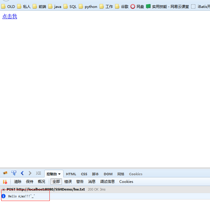 <!DOCTYPE html> <html lang="en"> <head> <meta charset="utf-8" /> <title>XMLHttpRequest测试</title> <script type="text/javascript"> window.onload=function(){ //监听a中的click事件 document.getElementsByTagName("a")[0].onclick=function(){ //创建XMLHttpRequest对象(注意大小写) //var request =window.XMLHttpRequest?new XMLHttpRequest():new ActiveXObject("Microsoft.XMLHTTP"); //考虑兼容性 //var request=init(); var request=new XMLHttpRequest(); function init(){ if (window.XMLHttpRequest) { return new XMLHttpRequest(); } else if (window.ActiveXObject) { return new ActiveXObject("Microsoft.XMLHTTP"); } } //添加时间戳 起到禁用缓存的效果 var url=this.href; //+"?time="+new Date(); //请求方式为GET请求 //var method='GET'; //请求方式为POST请求 var method="POST"; //准备发送请求(就像汽车发动机点火一样) request.open(method,url,true); //如果是Post请求,需要在此处添加setheader,格式如下: request.setRequestHeader("Content-Type","application/x-www-form-urlencoded;"); //发送请求(汽车运行..) //request.accept="text/html"; //request状态变化 request.onreadystatechange=function(){ //判断响应是否完成 if (request.readyState==4) { //判断响应是否可用 if(request.status==200){ //打印响应信息 console.info(request.responseText); } } }; var age=10; request.send("age="+age); //禁用a跳转 return false; }; }; </script> </head> <body> <a href="hw.txt">点击我</a> </body> </html>
