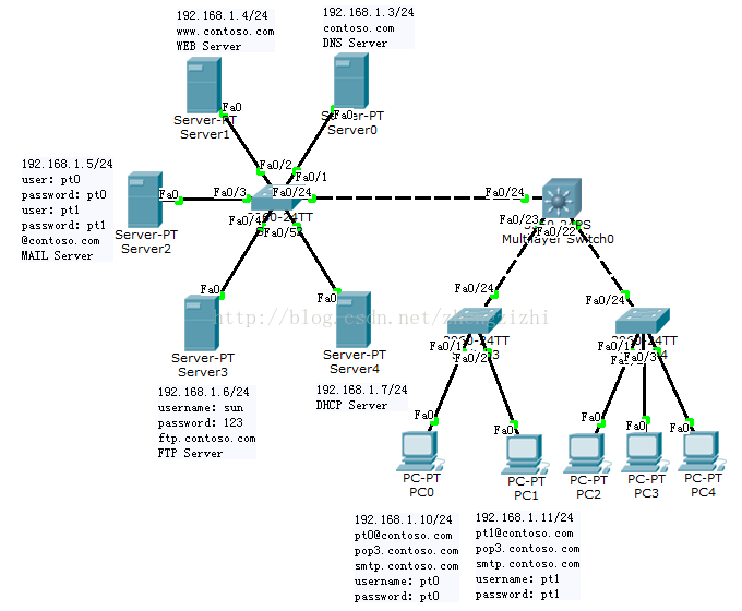 User pt0 | PC0 | 192.168.1.10 | 255.255.255.0 | 192.168.1.1 | 192.168.1.3 |