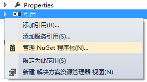 NuGet 是一种 Visual Studio 扩展,它能够简化在 Visual Studio 项目中添加、更新和删除库(部署为程序包)的操作。比如你要在项目中使用Log4Net这个库,如果没有NuGet这个扩展,你可能要先到网上搜索Log4Net,再将程序包的内容解压缩到解决方案中的特定位置,然后在各项目工程中依次添加程序集引用,最后还要使用正确的设置更新 web.config。而NuGet可以简化这一切操作。例如我们在讲依赖注入的项目中,若要使用一个NuGet库,可直接右击项目(或引用),选择“管理NuGet程序包”(VS2010下为“Add Library Package Reference”),如下图: