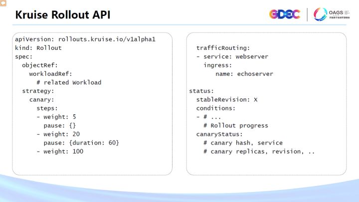 - 最后,Kruise Rollout 还能够通过 prometheus 中的业务指标判断发布是否正常。比如说,对于一个 web 类 http 的服务,可以校验 http 状态码是否正常。
