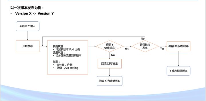 假如线上是 X 版本,现在需要发布到 Y 版本。首先,会将发布分为多个批次(比如,第一批只发布十个实例);然后,灰度一定规则的流量到 Y 版本,比如:像淘宝每次重大发布,会使用 A/B Testing 的方式,只将公司员工灰度到新版本;最后,验证新版本的健康情况,验证 OK 后,可以重复上述的过程,完成剩余的批次。如果在这个过程中发现了任何异常,可以快速回滚到 X 版本。通过上面这个例子,渐进式发布与全量发布相比,增加了很多中间的验证过程,渐进式发布可以说是极大的提高了交付的稳定性,尤其是针对一些大规模的场景而言,渐进式发布是非常有必要的。