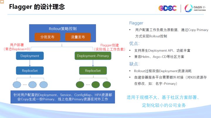 Flagger 的优势是支持原生 Deployment 、并且与社区的 Helm、Argo-CD 等方案都是兼容的。但是也存在一些问题,首先就是发布过程中的 Double Deployment 资源的问题,因为它是先升级用户部署的 Deployment,再升级 Primary,所以在这过程中需要准备双倍的 Pod 资源。第二呢,针对一些自建的容器平台需要额外对接,因为它的实现思路是将用户部署资源都 copy 一份,且更改资源的名字以及 Label。所以,Flagger 更加适合那种规模不大、基于社区方案部署、定制化较小的公司。