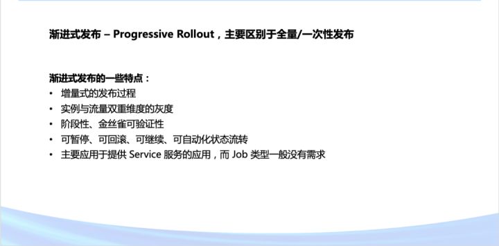 渐进式发布主要区别于全量、一次性发布。它主要包含以下特点: