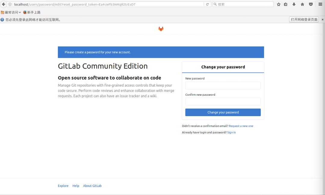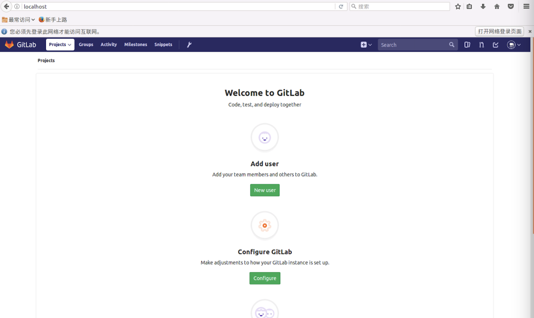 如果你的服务器内置了浏览器,现在就可以在浏览器中输入 localhost 预览 gitlab。