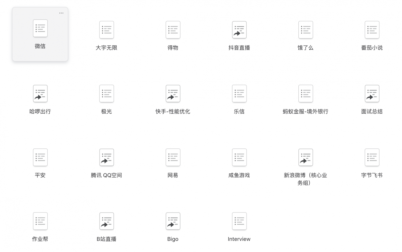 今年的前三个月都在不断地进行面试,总共面试了20十几家公司,整个面试的过程可谓是非常地曲折和漫长,其中的酸甜苦辣不由分说。每一场面试完之后,我都将对于的面试题总结到了对于的文档里,如下所示: