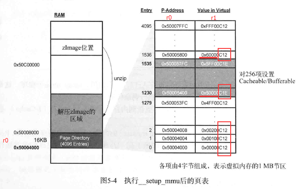 mov r12, lr @ 保存返回地址到r12,因为下面调用bl __setup_mm@ 时会将返回地址lr更新掉#ifdef CONFIG_MMUbl __setup_mmumov r0, #0/* 利用cp15将所有写缓冲的内容更新到内存,并清除指令缓存I-Cache和数据缓存D-Cache、TLB等读取CP15的控制寄存器内容,设置指令缓存激活位、RoundRobin缓存交替策略激活位。这部分参考ARM Linux内核源码剖析mcr p15, 0, r0, c7, c10, 4 @ drain write buffermcr p15, 0, r0, c8, c7, 0 @ flush I,D TLBsmrc p15, 0, r0, c1, c0, 0 @ read control regorr r0, r0, #0x5000 @ I-cache enable, RR cache replacementorr r0, r0, #0x0030#ifdef CONFIG_CPU_ENDIAN_BE8orr r0, r0, #1 << 25 @ big-endian page tables#endif/*__common_mmu_cache_on子程序使用了上面变更的域设置和“指令缓存”激活、缓存循环交替策略。同时将页目录的起始地址值存入CP15专用寄存器*/bl __common_mmu_cache_on@ 清除指令缓存、数据缓存、TLBmov r0, #0mcr p15, 0, r0, c8, c7, 0 @ flush I,D TLBs#endifmov pc, r12 @返回