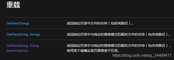 Directory.GetFiles是一个重载的方法。可以直接提供文件夹的路径获取所在目录中文件,返回一个文件全名的字符串数组。