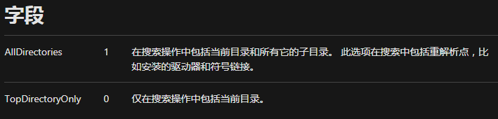 三参数的时候,SearchOption 是表示指定是搜索当前目录,还是搜索当前目录及其所有子目录。其可用参数如下: