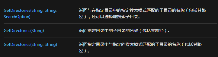 这也是和GetFiles类似的重载方法。只是返回满足指定条件的子目录的名称。