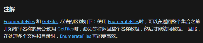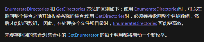 这两个枚举文件方法的使用是和上面我提到的GetFiles/GetDirectories是一样的。 只是返回的结果是一个可枚举的集合而不是我们之前的字符串数组。具体我就不写了。
