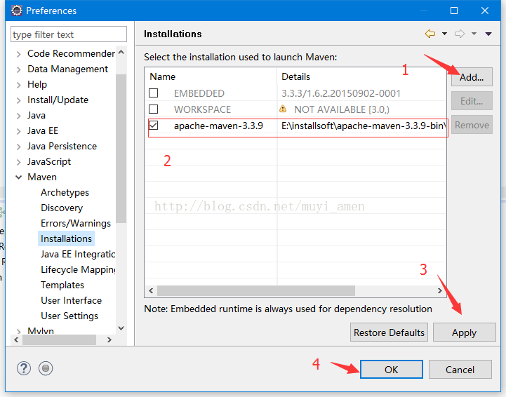 3、在eclipse的“window”---“preferences”--"maven"--"installations",在右边的面板中点击“add”按钮,添加刚才的maven的安装目录,如图: