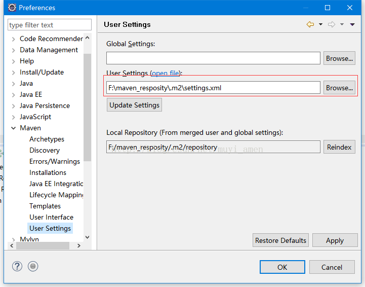 4、在eclipse的“window”---“preferences”--"maven"--“user setting”右边的面板中配置如下内容: