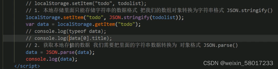 注意2:获取本地存储数据,需要把里面的`字符串转换为对象格式` JSON.parse() 我们才能使用里面的数据