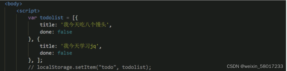 var todolist=[{title;'xxx',done:false}] // title:'文本框的内容' done:是否完成