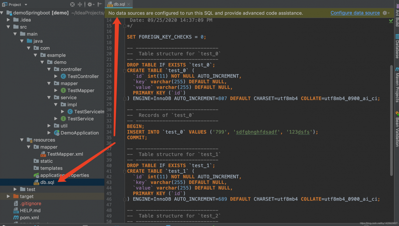 项目数据库表及数据:项目中db.sql文件为demo的数据库文件,需要把数据库的表和数据导入到自己的mysql中。这样项目启动后调用接口就可以增删改查数据了。(该文件中只有表和数据,没有数据库,需要自己创建数据库,记得调整配置文件中的数据库名称与你的数据库名称一致)