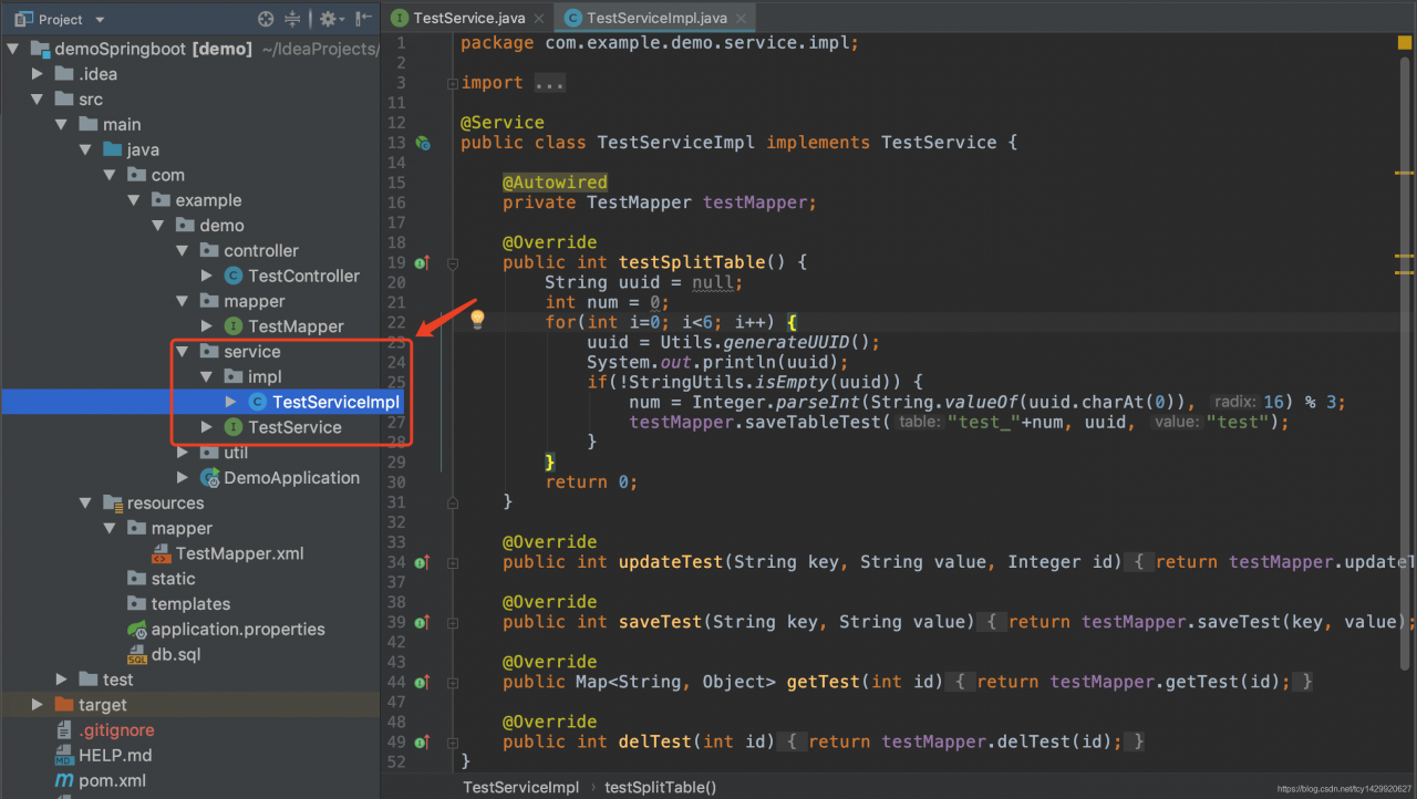 接口控制器:调用接口时根据接口路径,找到指定的控制器类,然后再找到指定的接口方法,然后执行接口方法的业务,达到想要的目的。(例:图中想要执行testSplitTable方法的访问路径为 /test/testSplitTable)
