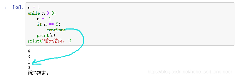 从例子中就可以看出,continue是执行到该语句时,下面的语句不再执行,继续执行下一个循环过程。