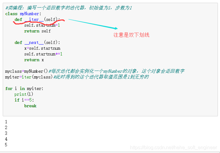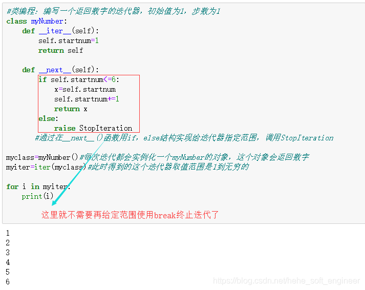 ① __iter__() 方法返回一个特殊的迭代器对象, 这个迭代器对象实现了 __next__() 方法并通过触发 StopIteration 异常标识迭代的完成(目的就是识别循环结束的情况,防止出现无限循环的情况)。