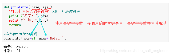 (2)关键字参数: 使用关键字参数允许函数调用时参数的顺序与声明时不一致,因为 Python 解释器能够用参数名匹配参数值。
