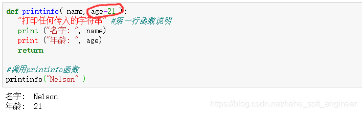调用函数时,如果没有传递参数,则会使用默认参数。以下实例中如果没有传入 age 参数,则使用默认值: