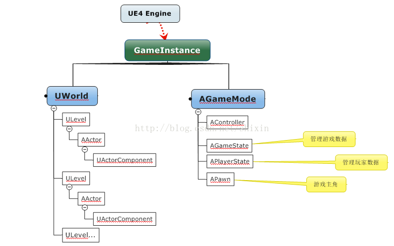 从上图可以可看出,一个游戏实例对象GameInstance包含一个UWorld和一个GameMode对象。UWorld下包含1到N个Level;GameMode下管理着Controller、GameState、PlayerState和Pawn等对象。