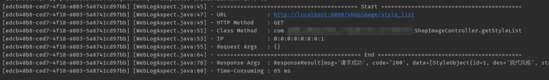 可以看到图内的一次方法调用,会输出请求url,出入参,以及请求IP等等,之前为了好看,还加入了分割线。