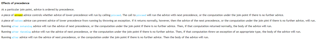 At a particular join point, advice is ordered by precedence.A piece of around advice controls whether advice of lower precedence will run by calling proceed. The call to proceed will run the advice with next precedence, or the computation under the join point if there is no further advice.