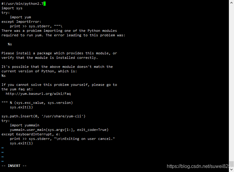 2、执行vi /usr/bin/yum,同样修改最顶部的一行,改成python2.7,修改后 按ESC,然后shift+: wq保存退出