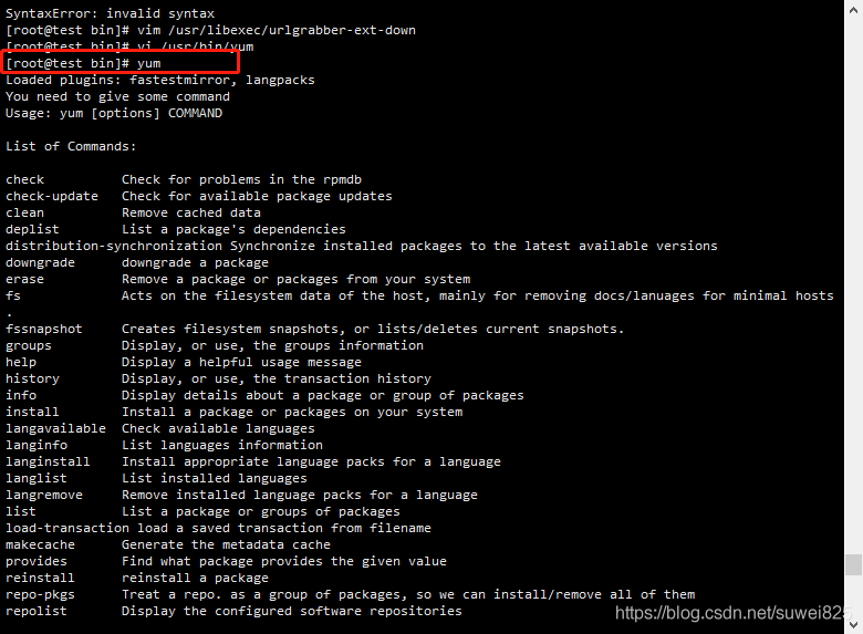 3、修改完上面的依赖后,我们再次终端输入 yum,出现help,说明yum命令正常了