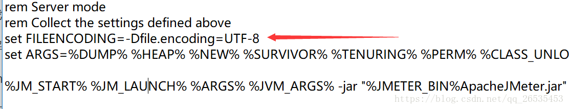 在ARGS前添加 set FILEENCODING=-Dfile.encoding=UTF-8,在set ARGS= 后添加 %FILEENCODING% 保存,并重启jmeter.