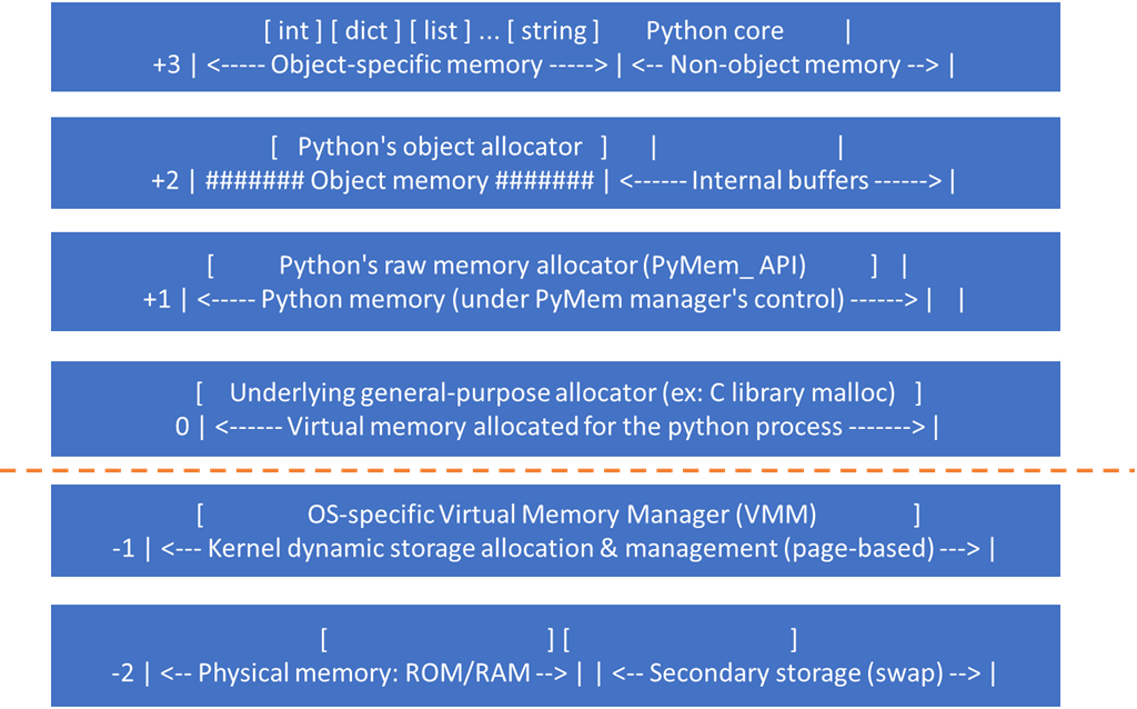 Python实现了一个内存池(memory pool)机制,使用Pymalloc对小块内存(小于等于256kb)进行申请和释放管理。