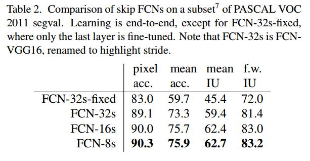从分类到分割的微调对每层网络有一个合理的预测。甚至最坏的模型也能达到大约75%的良好表现。内设分割的VGG网络(FCN-VGG16)已经在val上平均IU 达到了56.0取得了最好的成绩,相比于52.6 [17] 。在额外数据上的训练将FCN-VGG16提高到59.4,将FCN-AlexNet提高到48.0。尽管相同的分类准确率,我们的用GoogLeNet并不能和VGG16的分割结果相比较。