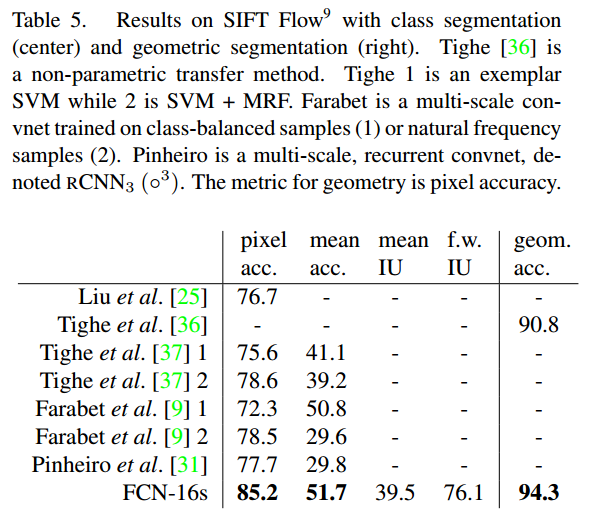 SIFT Flow是一个带有33语义范畴(“桥”、“山”、“太阳”)的像素标签的2688张图片的数据集和3个几何分类(“水平”、“垂直”和“sky")一样。一个FCN能自然学习共同代表权,即能同时预测标签的两种类别。我们学习FCN-16s的一种双向版本结合语义和几何预测层和损失。这种学习模型在这两种任务上作为独立的训练模型表现很好,同时它的学习和推理基本上和每个独立的模型一样快。表5的结果显示,计算在标准分离的2488张训练图片和200张测试图片上计算,在这两个任务上都表现的极好。